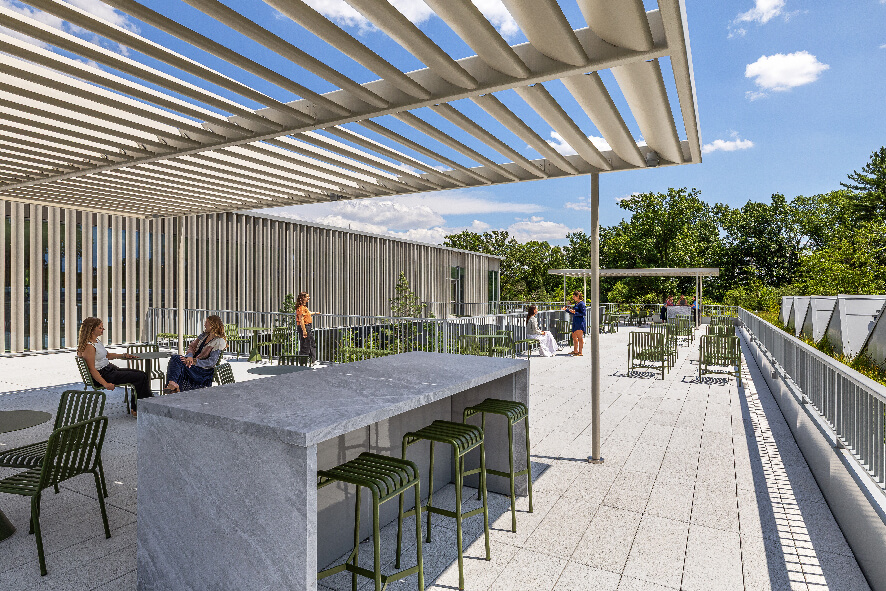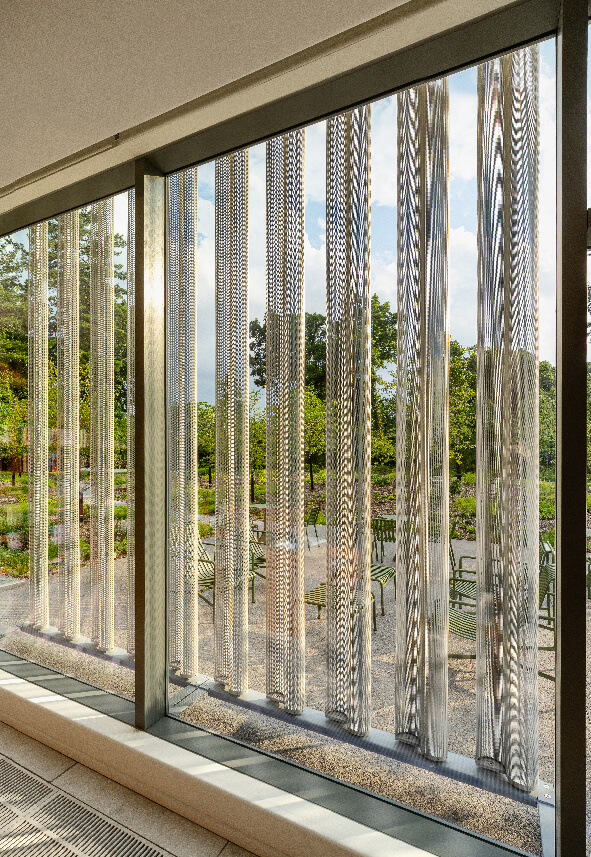 El edificio de dos plantas alcanza una altura de 9 metros. Los requisitos arquitectónicos, diversos y técnicamente exigentes, incluían fachadas de acero y vidrio con tubos rectangulares soldados a prueba de balas, y una fijación invisible del vidrio mediante un sistema de palanca y juntas de vidrio de silicona. La fachada se complementa con tapajuntas verticales de protección solar de aluminio y muros cortina y claraboyas de terracota.