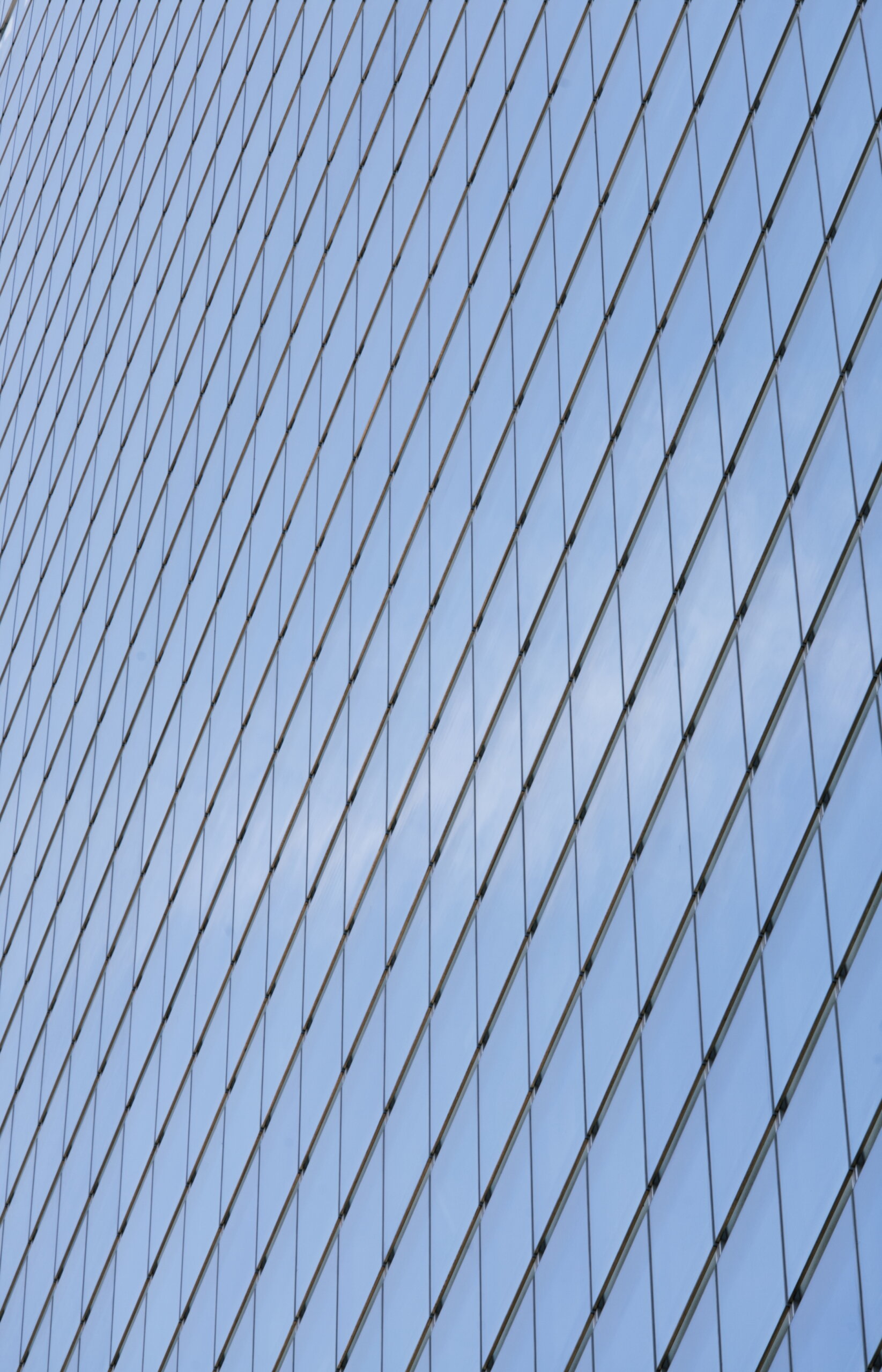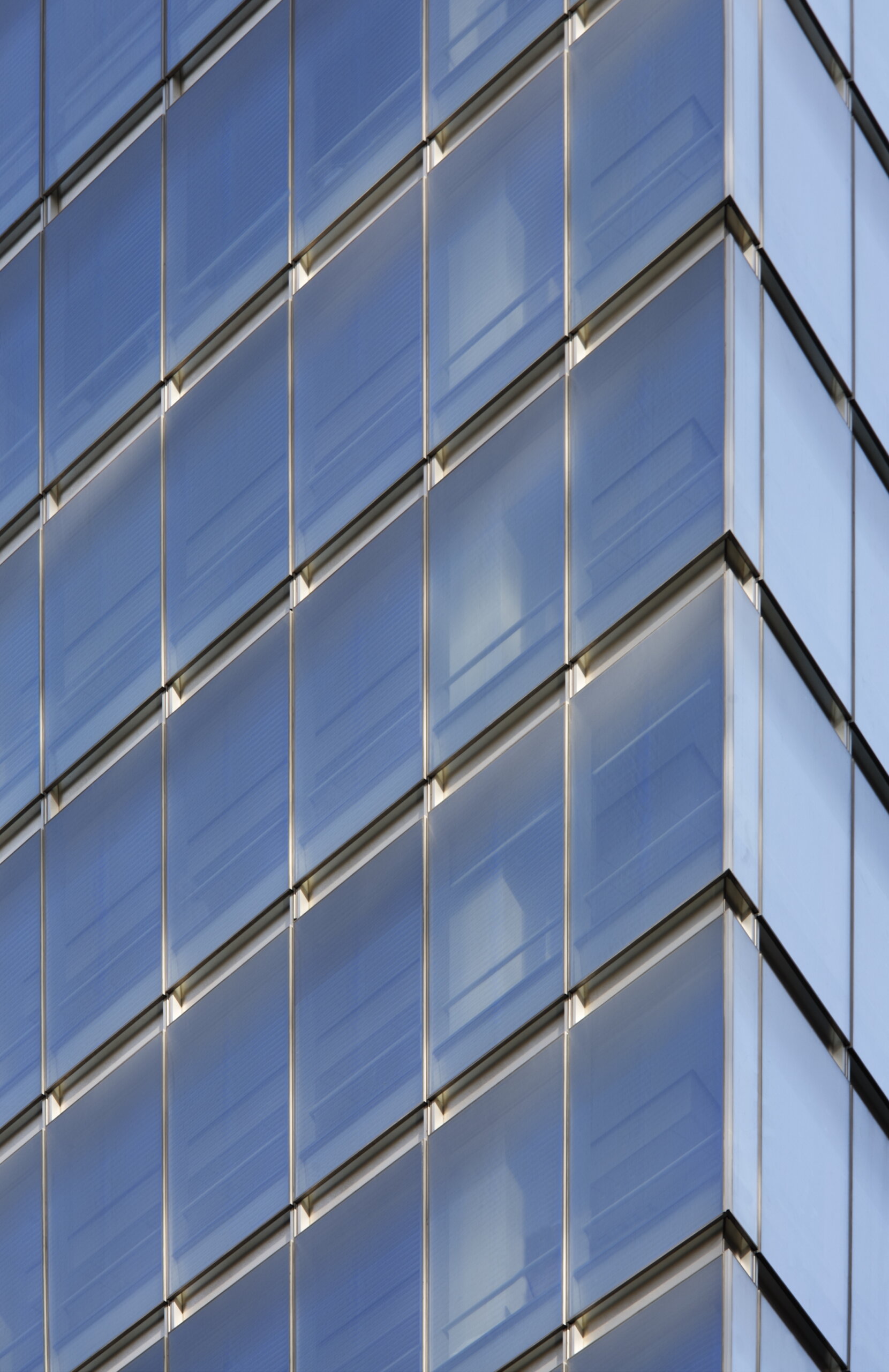 The 52-storey tower rises to 226.5m and comprises three main elements: a sharply angled main body with a transparent glass envelope; a podium clad in stainless-steel panels; and a radiant blue block that creates a visual link between the podium and glass tower.