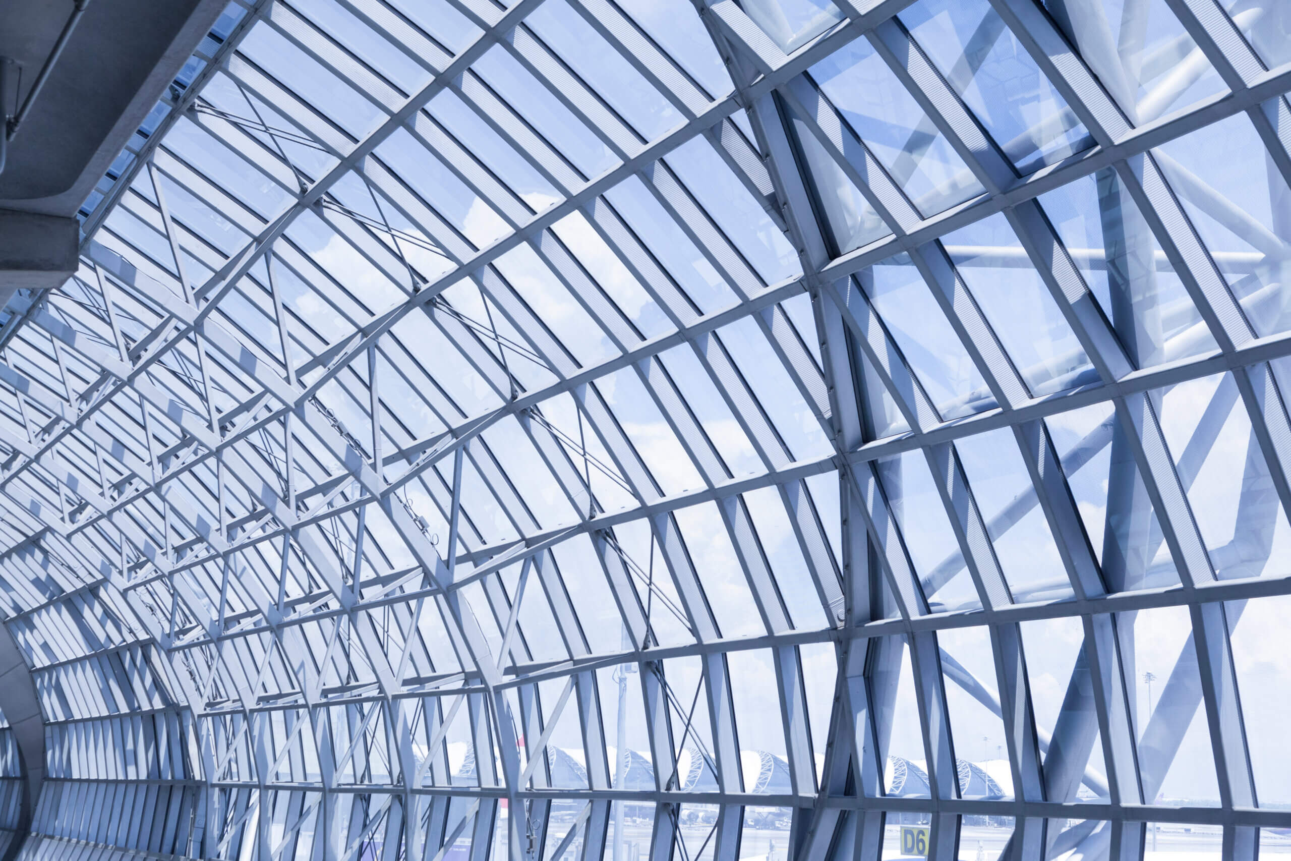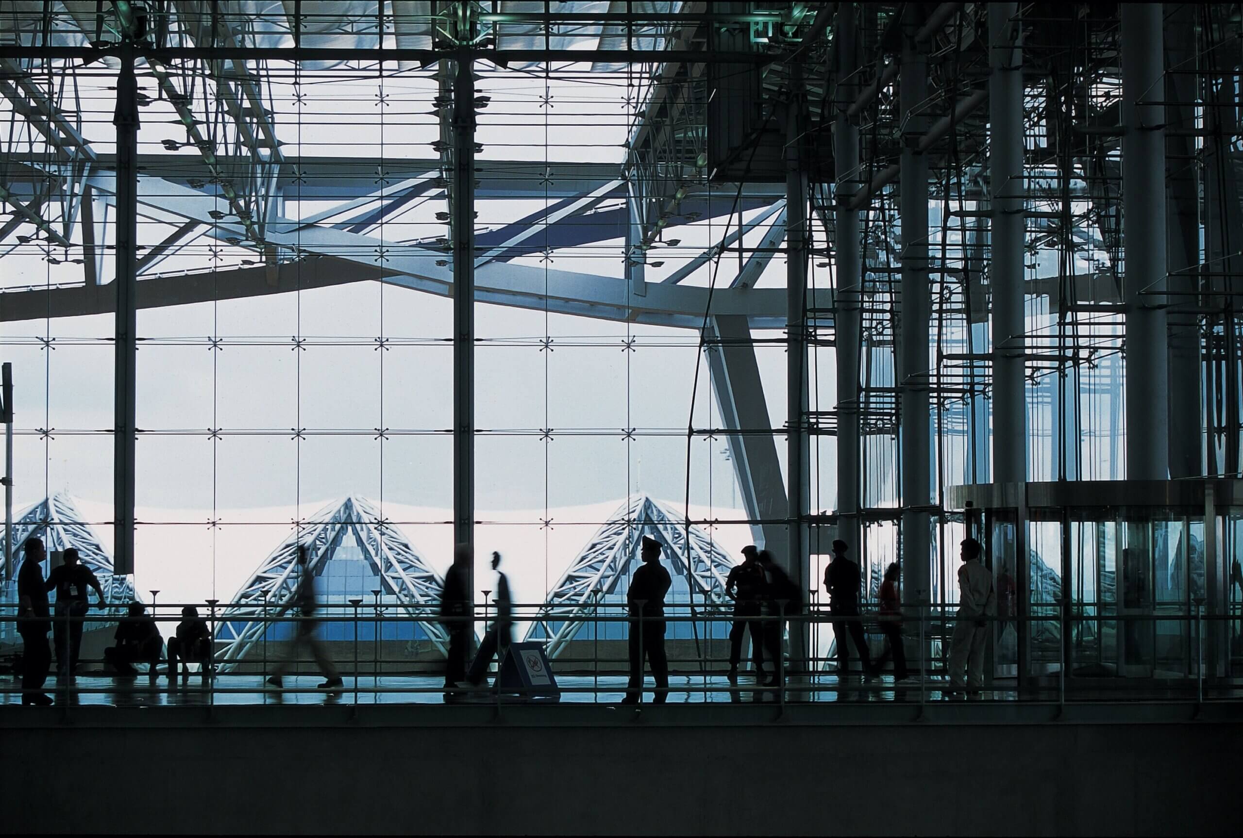 The arrival and departure halls are fully glazed, combining steel, concrete, glass and membrane for architectural, structural and environmental benefits. A large roof trellis placed over the complex of buildings unifies the site and shades the structures below from direct sunlight. The trellis also shades outdoor areas, which feature landscaped courtyards for use by passengers.