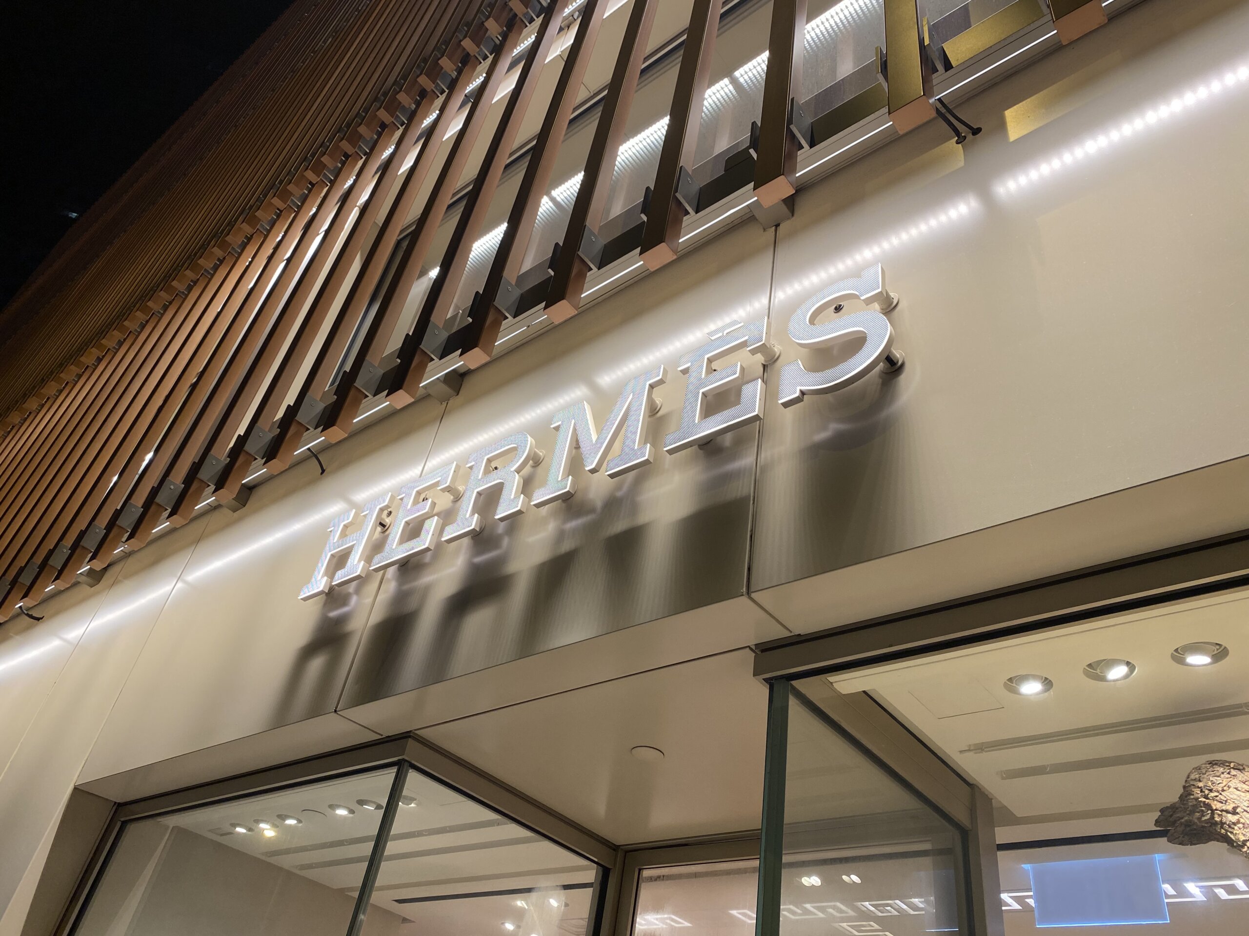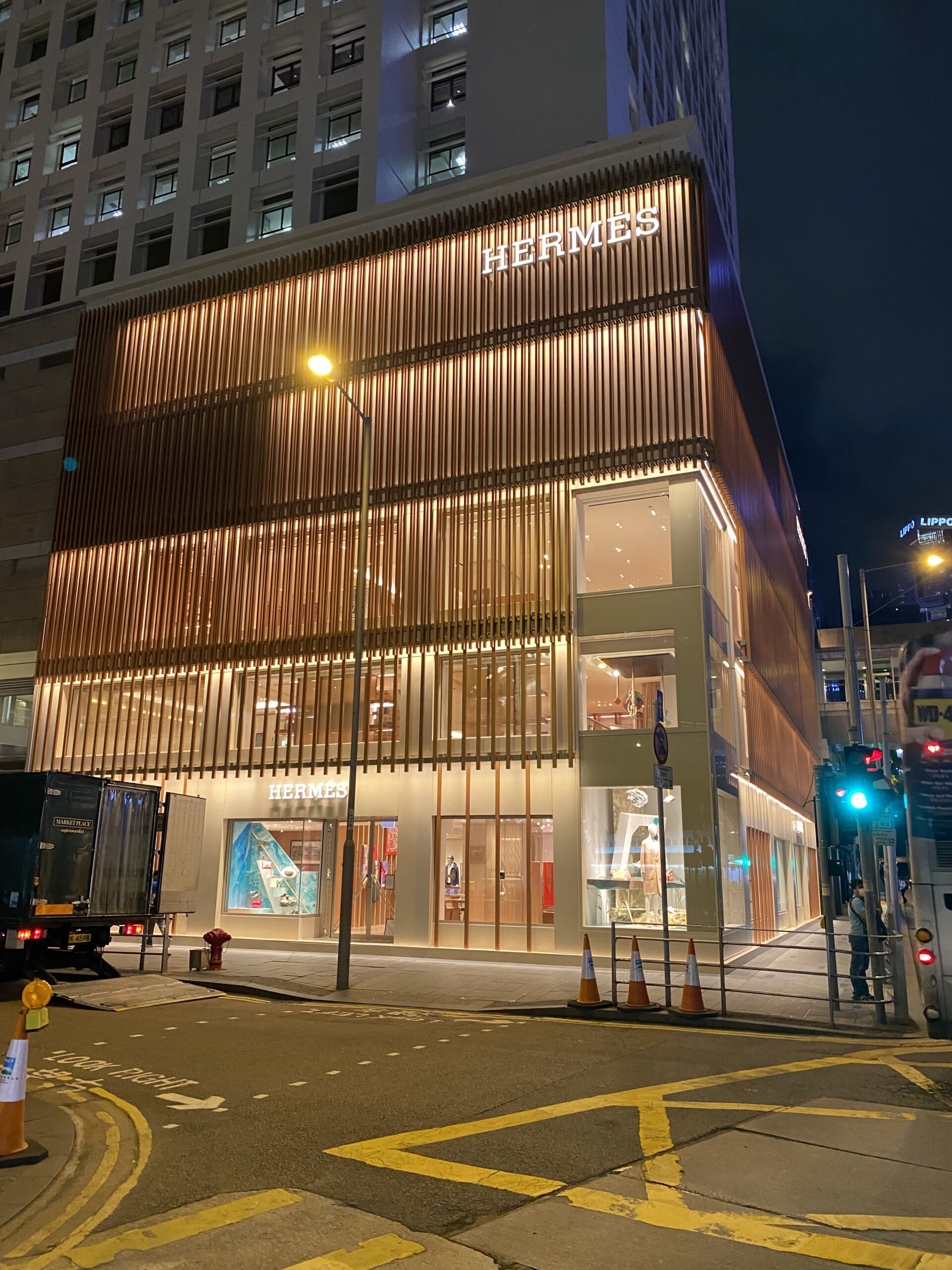 Deze prachtige Hermès-winkel werd gebouwd als onderdeel van de complexe renovatie van het historische Prince's Building in Hongkong, dat dateert uit 1965.