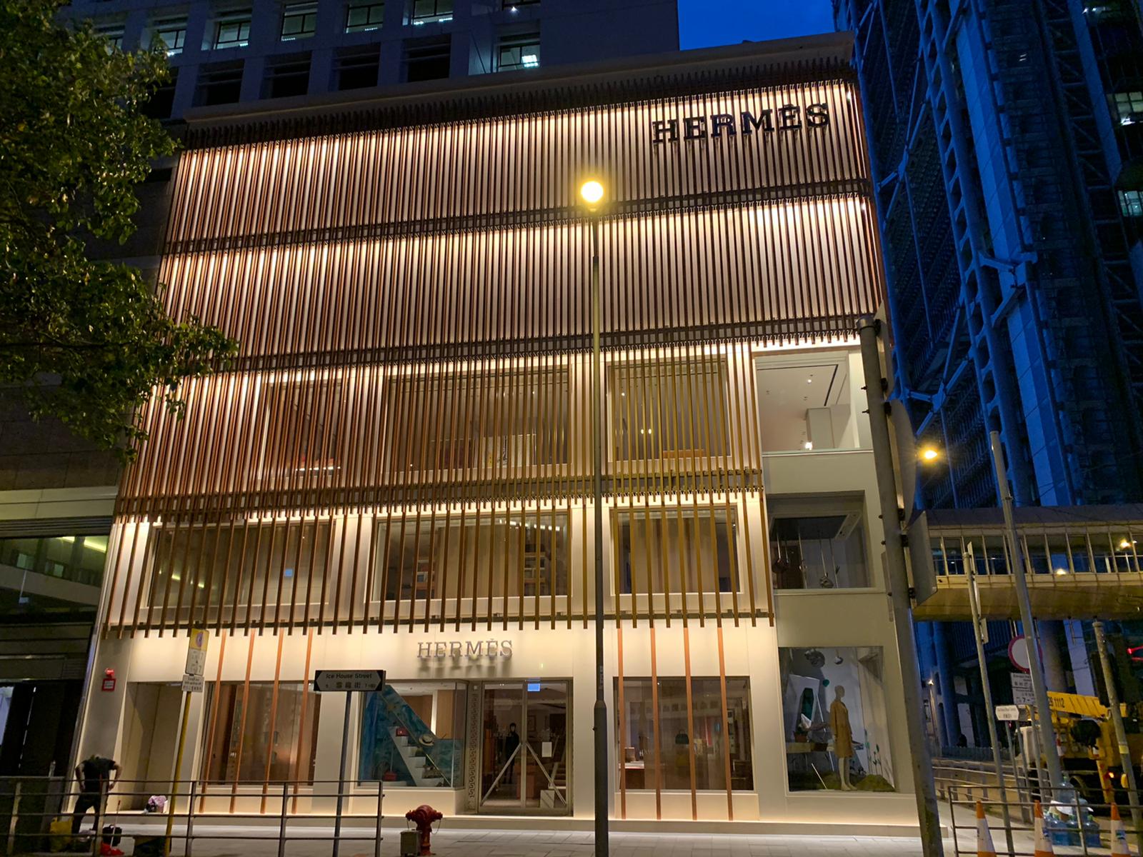 Architect RDAI liet zich inspireren door lokale bamboesteigers bij het ontwerpen van zowel het exterieur als het interieur van de winkel. De gevel bestaat in totaal uit 8 km rechthoekige buizen en steekt nog eens twee verdiepingen uit boven de winkelruimte van drie verdiepingen, waardoor Hermès aanwezigheid op een prominent kruispunt in de stad wordt benadrukt.