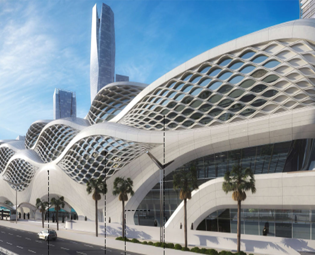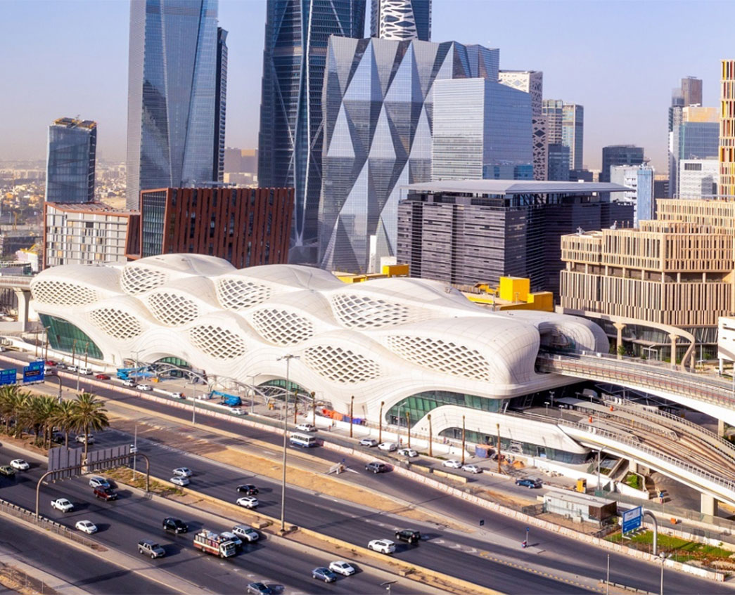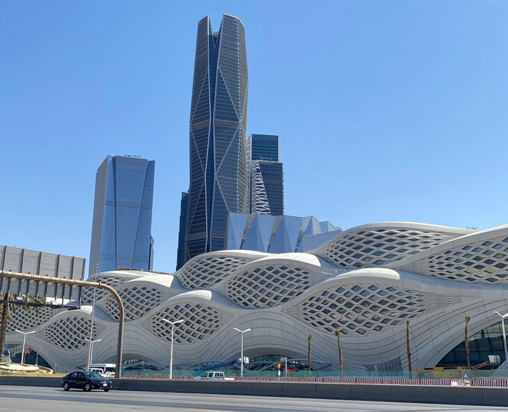 De sculpturale gevel van het spectaculaire KAFD metrostation weerspiegelt de natuurlijke patronen die woestijnwinden op zand achterlaten.