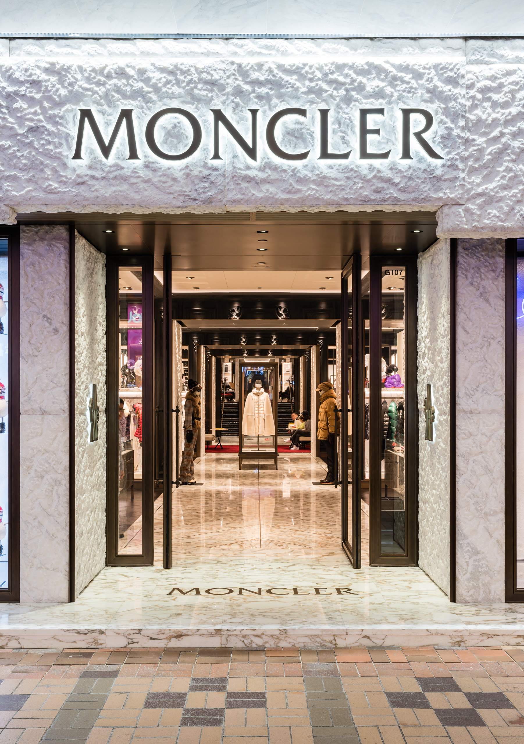 De winkel - de visie van architectuurstudio Gilles & Boissier - weerspiegelt Monclers waarden van innovatie, kwaliteit, creativiteit, originaliteit en experiment. De buitenkant van de winkel is in lijn met het interieurconcept en verwelkomt klanten in de 'haute montagne'-wereld van Moncler.
