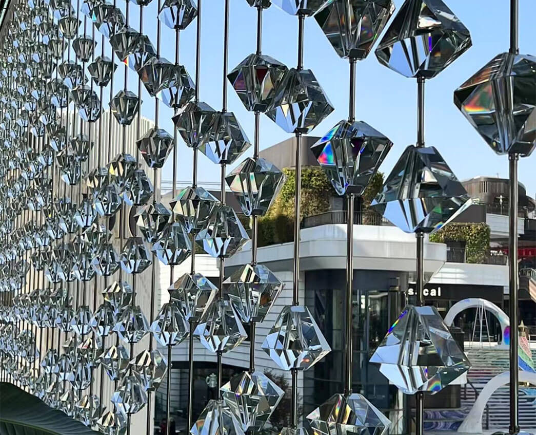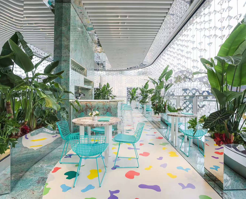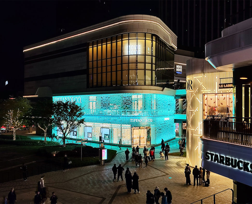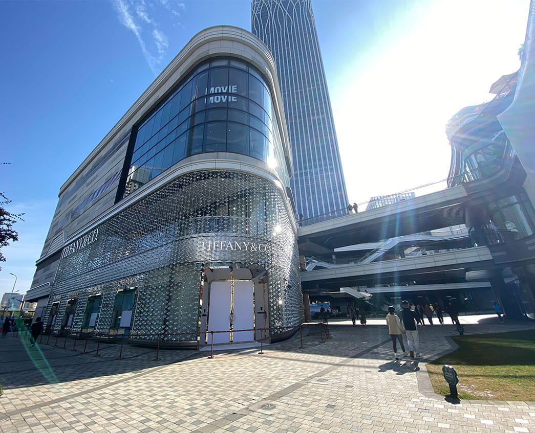 Met een buitenscherm van bijna 7.000 handgemaakte glazen 'diamanten' is de gevel van deze winkel een eerbetoon aan de beroemde juwelenontwerpen van Tiffany & Co.
