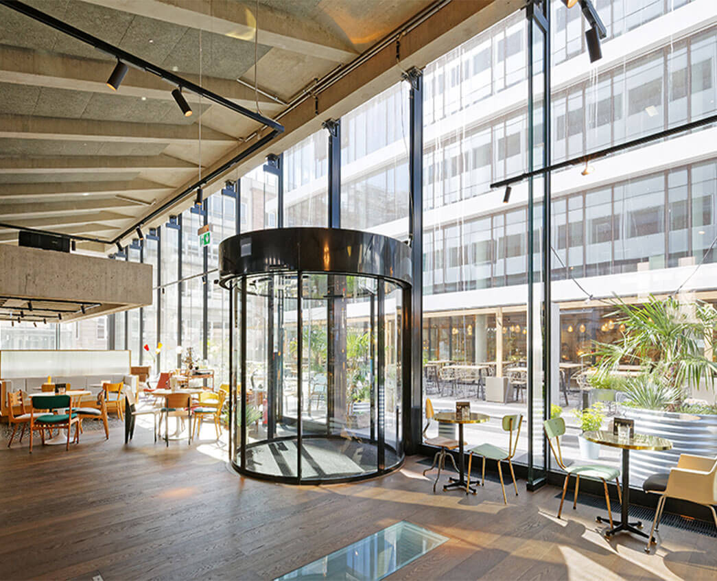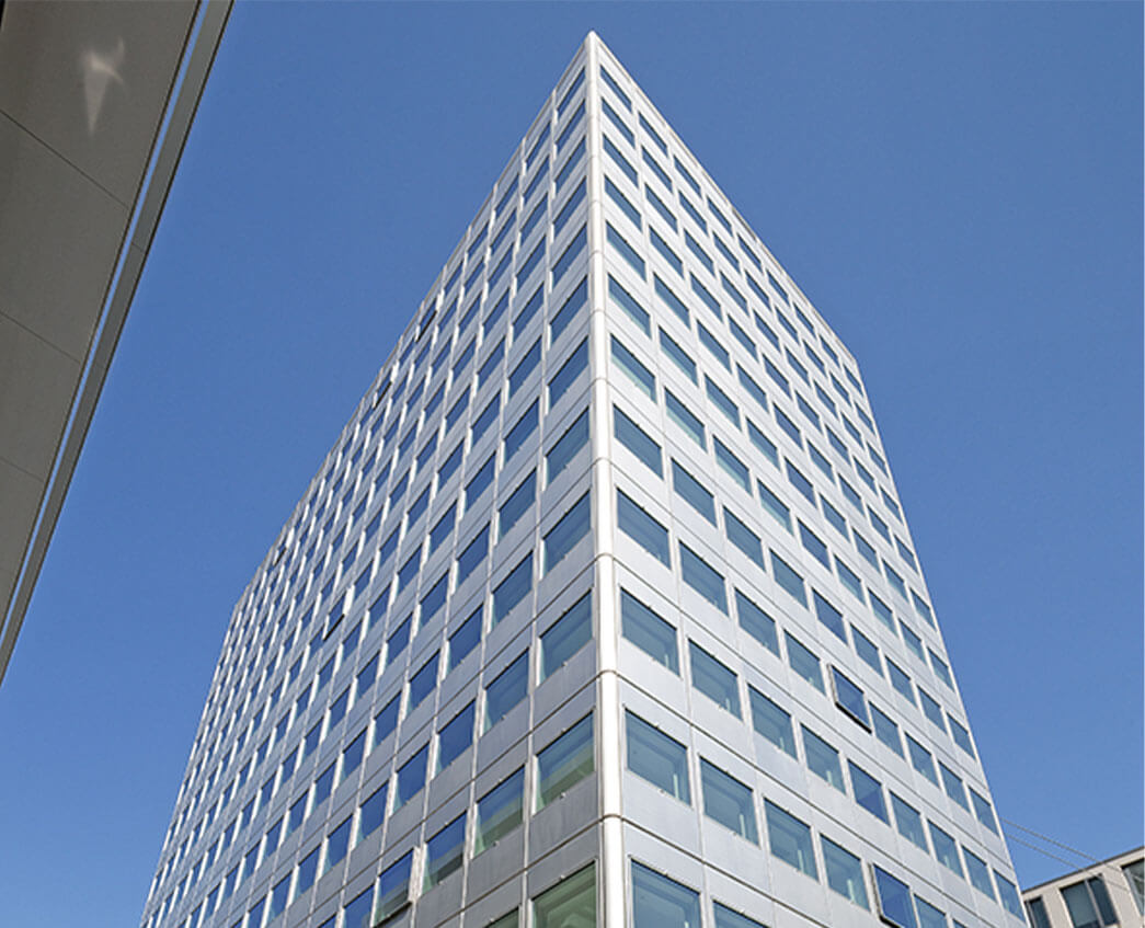 The 12-storey tower includes a roof terrace and a ground floor with a surrounding glass-fin façade. The building accommodates a hotel, as well as offices.