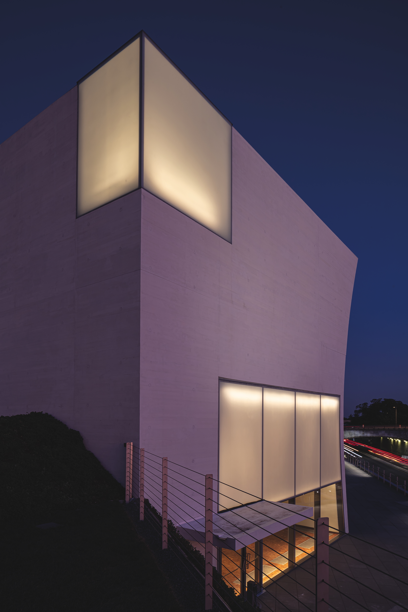 The REACH is comprised of three pavilions built to provide new event and catering spaces. The buildings feature curved edges with hard angles and flat or sloping roofs. At the centre of the area, the Skylight Pavilion emerges from the landscape, featuring a large wall of concrete designed as an area for open-air film projections. At the lowest part of the grass hill, the River Pavilion, which accommodates interactive spaces for smaller performances, features a 12m glass front.